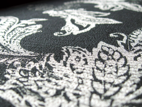古くは醍醐天皇時代に盛んに織られ宮廷献上品として用いられた(紗・羅)と呼ばれる絹の薄く荒い絡み織物を現代風に合成繊維でアレンジし、さらに丹後産地(京都)の特徴である強撚糸を使った、ちりめん組織で表現しました。